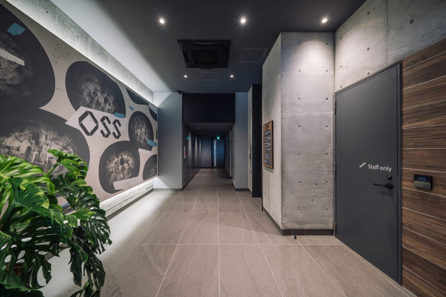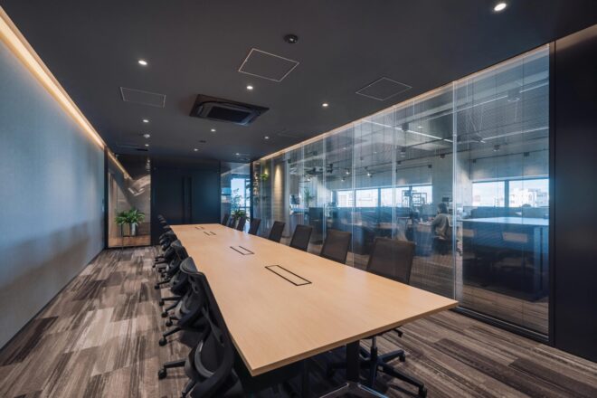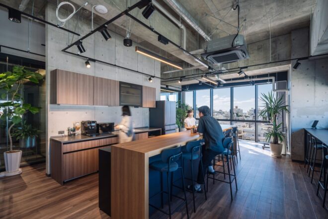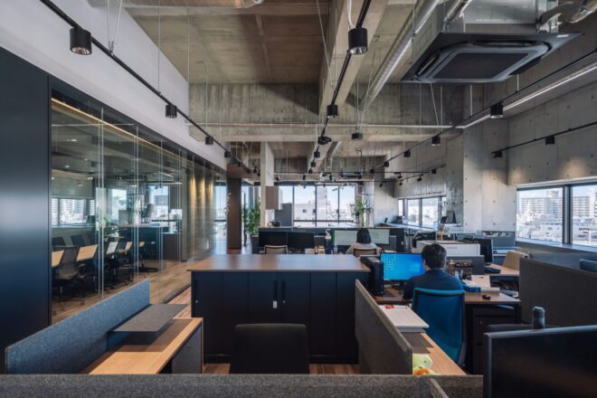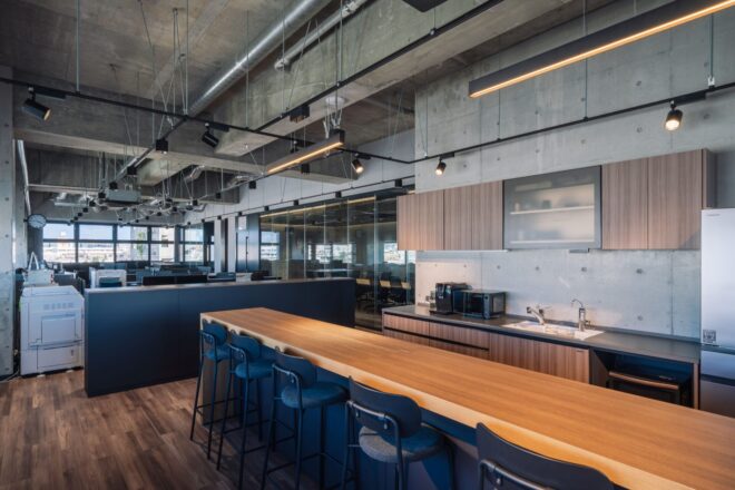 国道に沿った水平ラインの庇に様々な素材の木調を組み合わせることで街に柔らかな明るさ、賑わいをもたらす効果を期待した。視認性の高い西北側を美しくみせるために、東側に設備バルコニーを、南側に雨樋や換気口を集約し、延焼ラインを考慮しながら、窓の配置や防火上有効な袖壁を計画した。柔軟に変化を受け入れられるように、専用部と共用部を明確に分離、排煙窓を東西に設えたことで、オフィスの規模によって、仕切壁の位置を自由に決められる。かつ、PS/EPSを共用廊下側に配置し、躯体現しのスケルトンにすることで借り手の好みに合わせた空間が実現可能である。