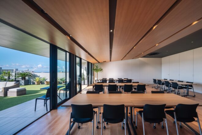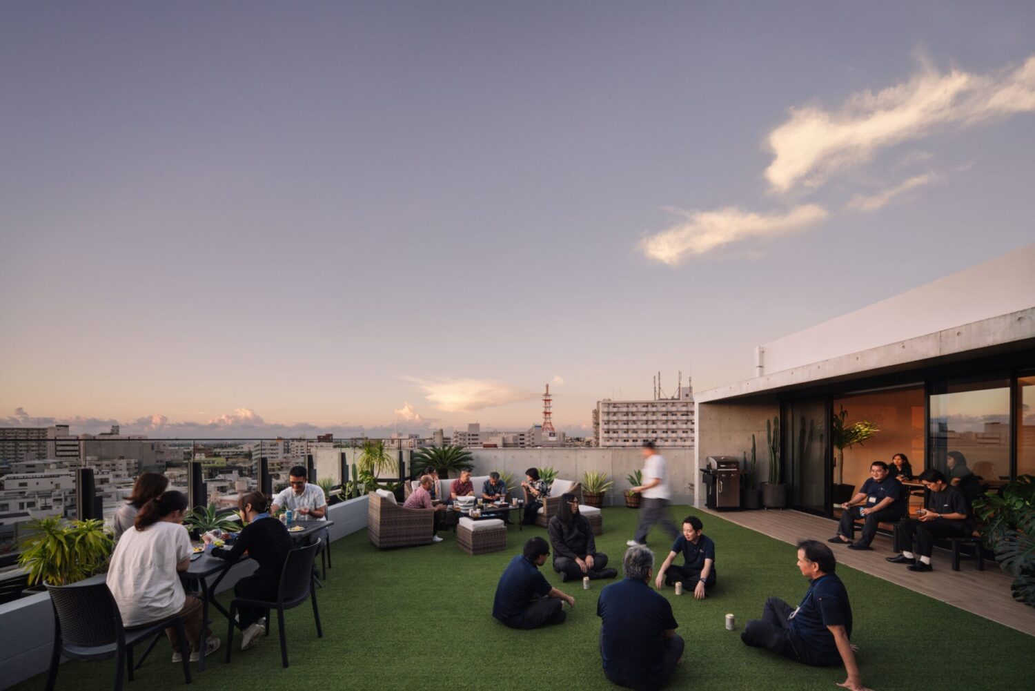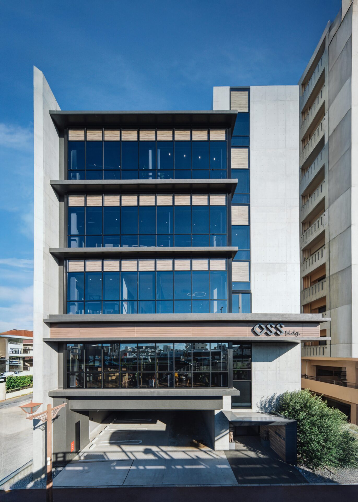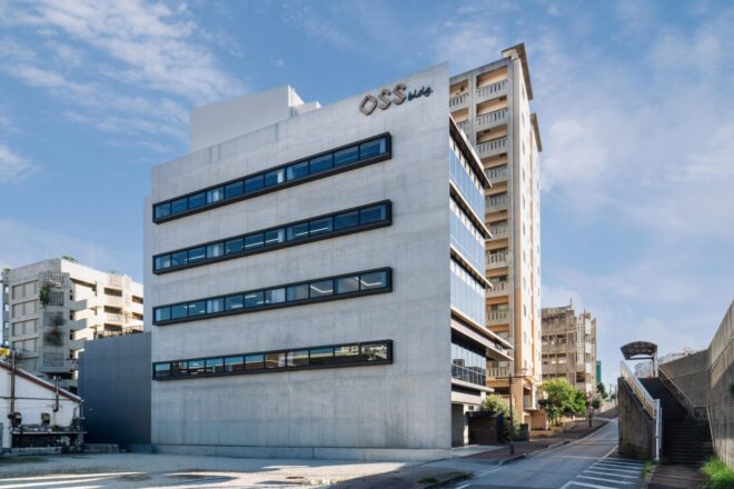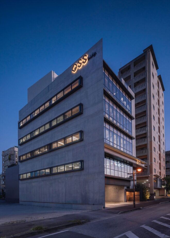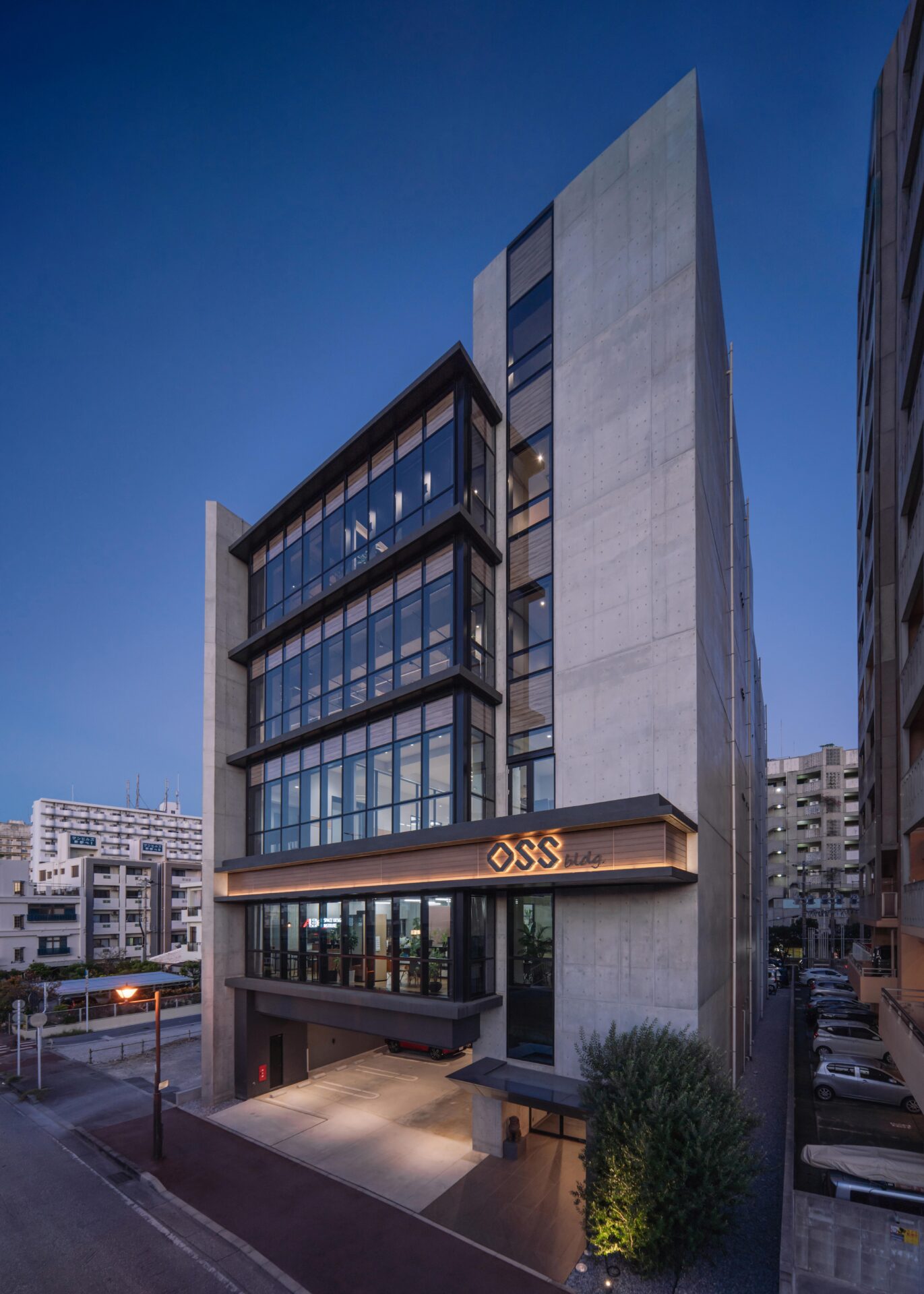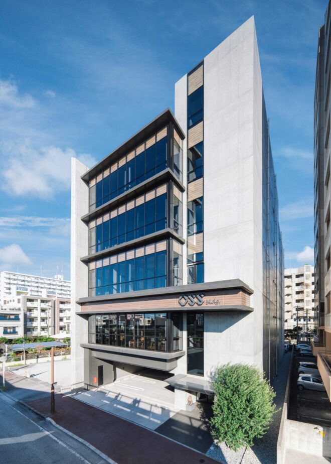 沖縄の建設業を製本事業やCAD支援など多角的なアプローチで半世紀近く支え続けている企業の自社ビル。低層階にはテナントオフィスを計画し、商業ビルとして永らく価値のある建物になるように変化を包容できるデザイン、最上階には様々な入居企業のスタッフが交流するラウンジと屋上テラスを設えた。長らく「紙」とともに歩み続けた企業の自社ビルにふさわしいように、紙の原材料である「木」と、沖縄の街に欠かせない「コンクリート」を融合したデザインを目指した。