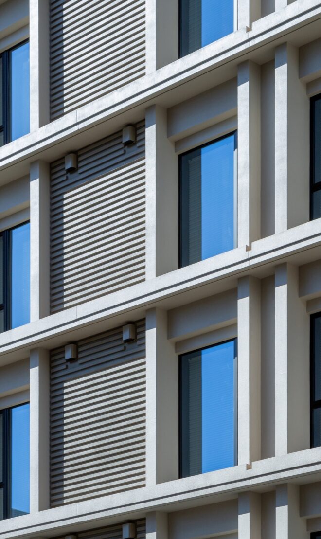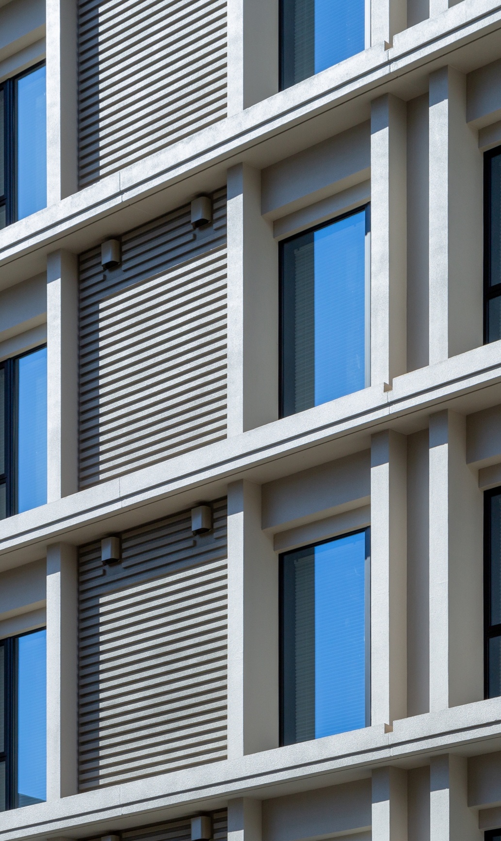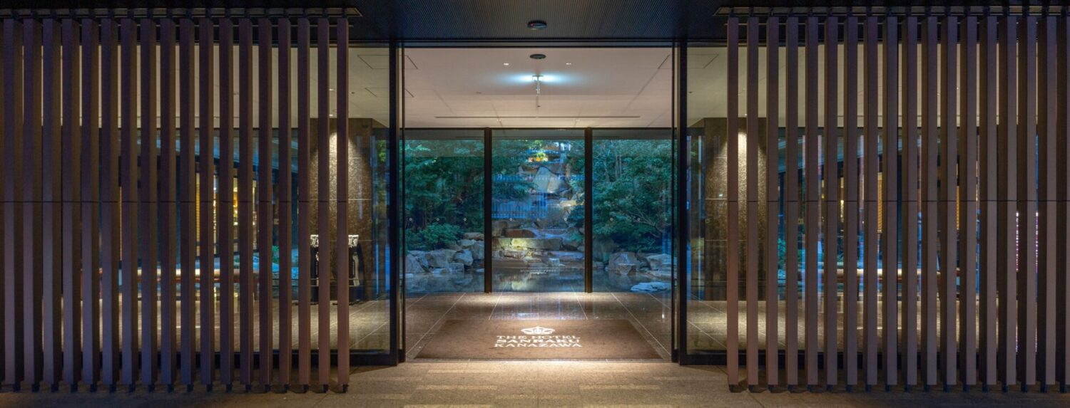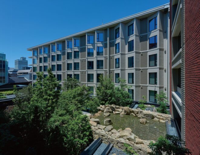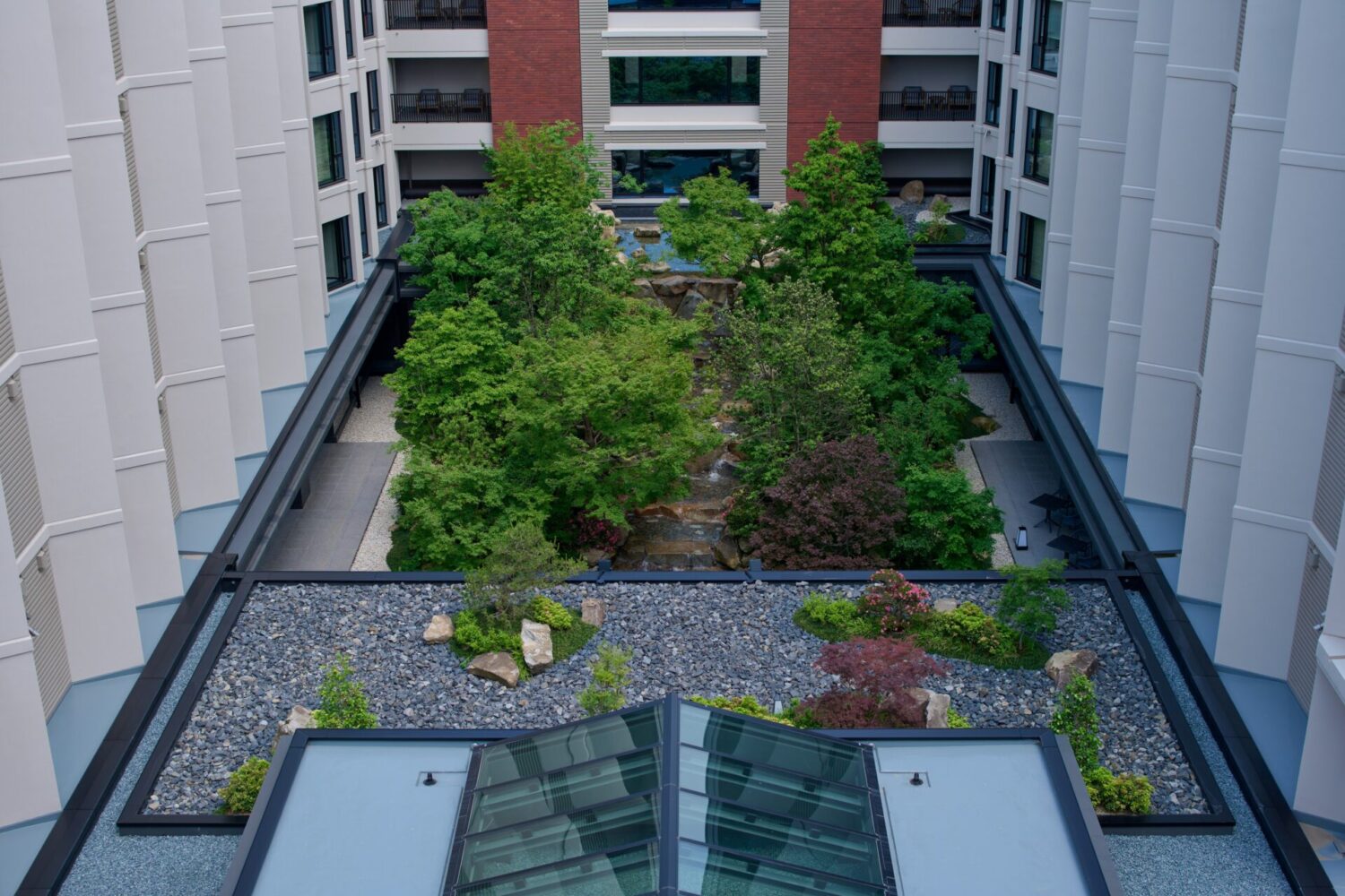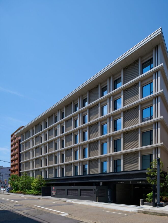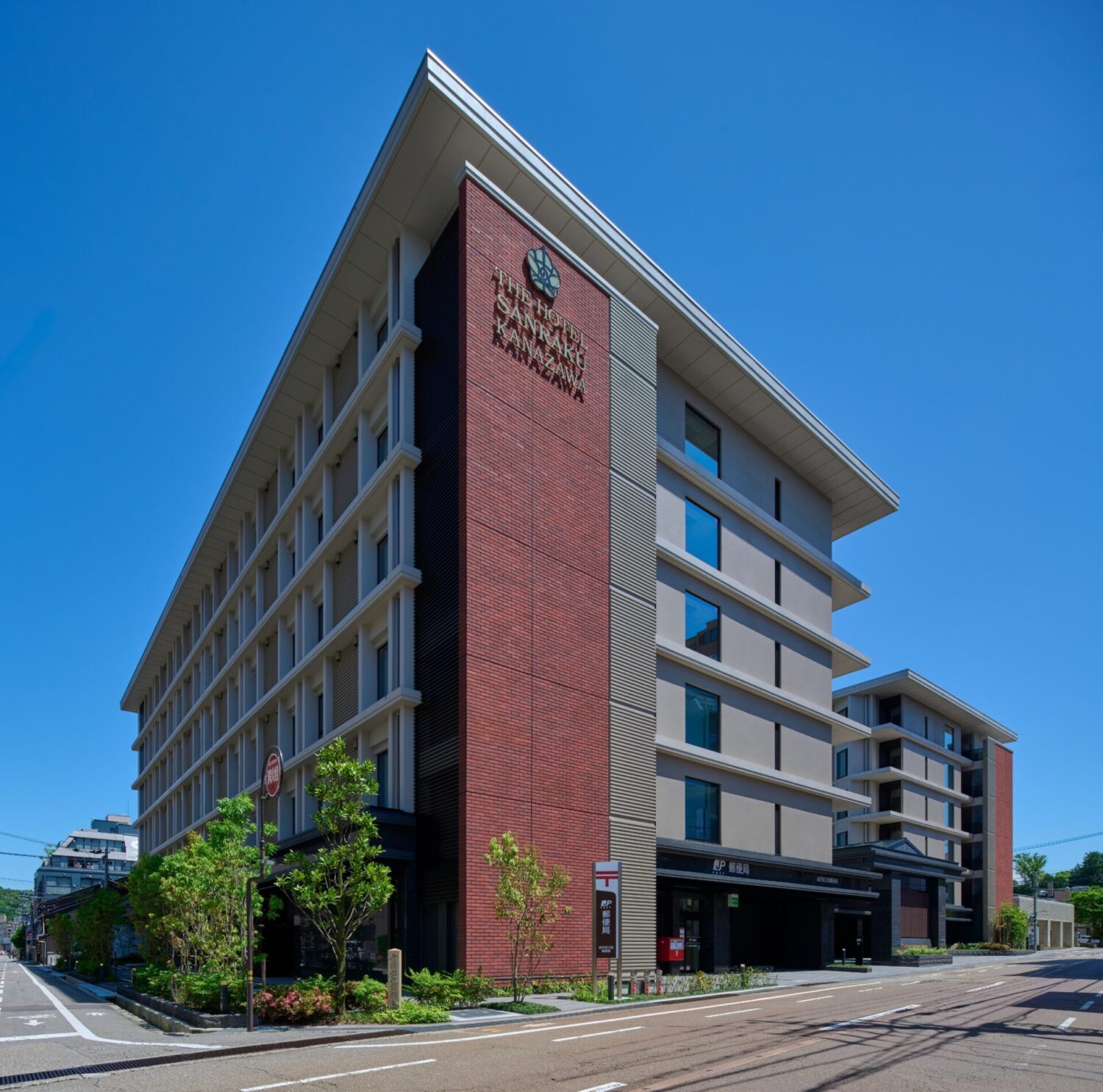 外観は、水平ラインを強調する庇、外壁面の凹凸を基調とし、地域の景観との調和を図っている。ホテル正面玄関には金沢古民家の特徴でもある面格子「木虫籠(キムスコ)」に見立てたテラコッタルーバーを設け、目隠しとともにアプローチの演出とした。エントランスの正面には中庭空間が広がる。「唯一無二の世界観」をコンセプトに圧倒的な存在と瑞々しい緑と滝の景が客をもてなす。客室は視線の交錯を避けて中庭を眺められる計画とし、四季折々の中庭の表情をホテル全体が享受できる。