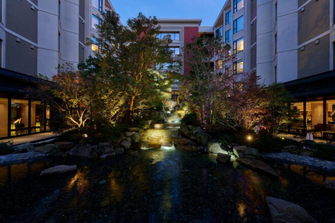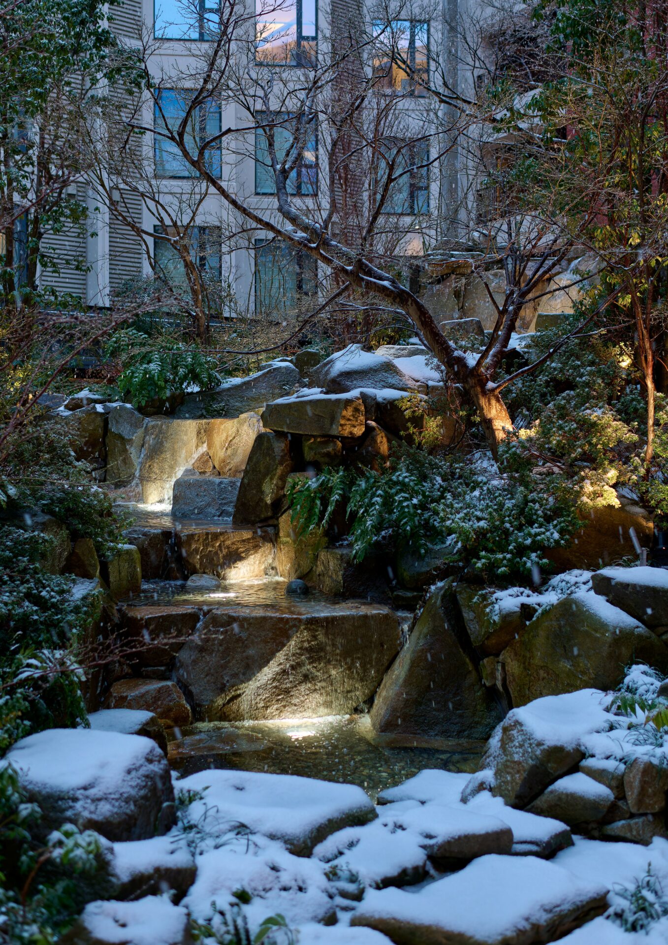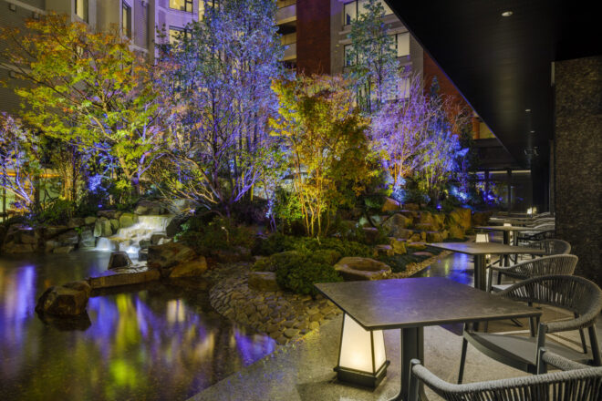 中庭の照明デザインは「光のきざはし」をコンセプトに四季の移り変わりに応じたシーン演出プログラムを設定。中庭の表情に奥行きをもたらす演出としている。